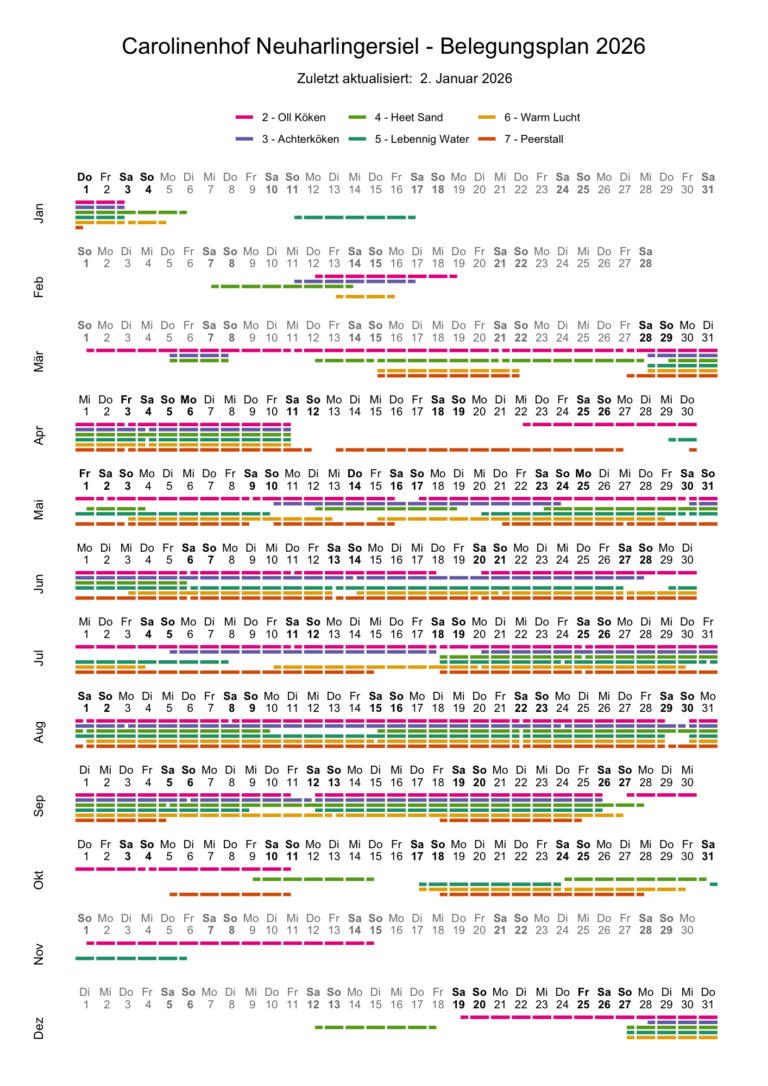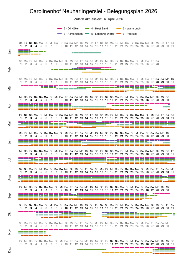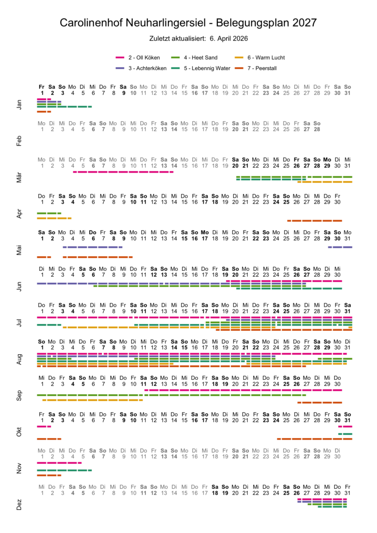 Hier können Sie sehen, wann welche Ferienwohnung im Jahr 2026 bzw. 2027 verfügbar ist (bunt = bereits belegt).